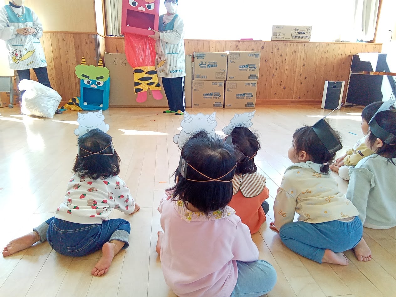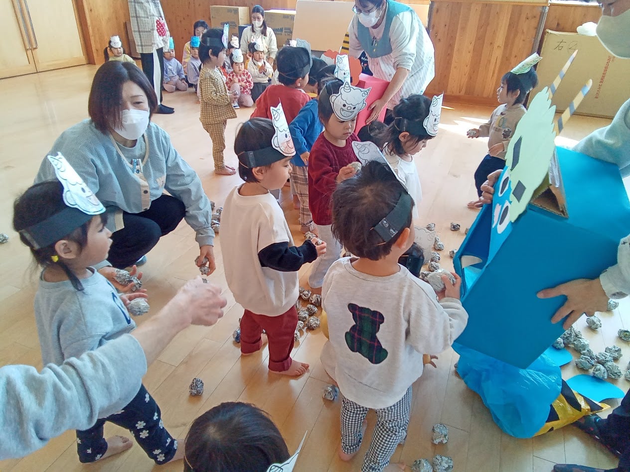 令和7年度 節分(豆まき) 2026年2月3日 by ksdtadmin 2月3日に節分(豆まき)をしました。乳児クラスは、鬼の口に新聞紙の豆を入れるゲームを楽しみました。幼児クラスは、「なきむしおに」や「おこりんぼおに」を退治するために、大きな声で豆まきを頑張りました!お昼には可愛い鬼っ子寿司を食べました。
